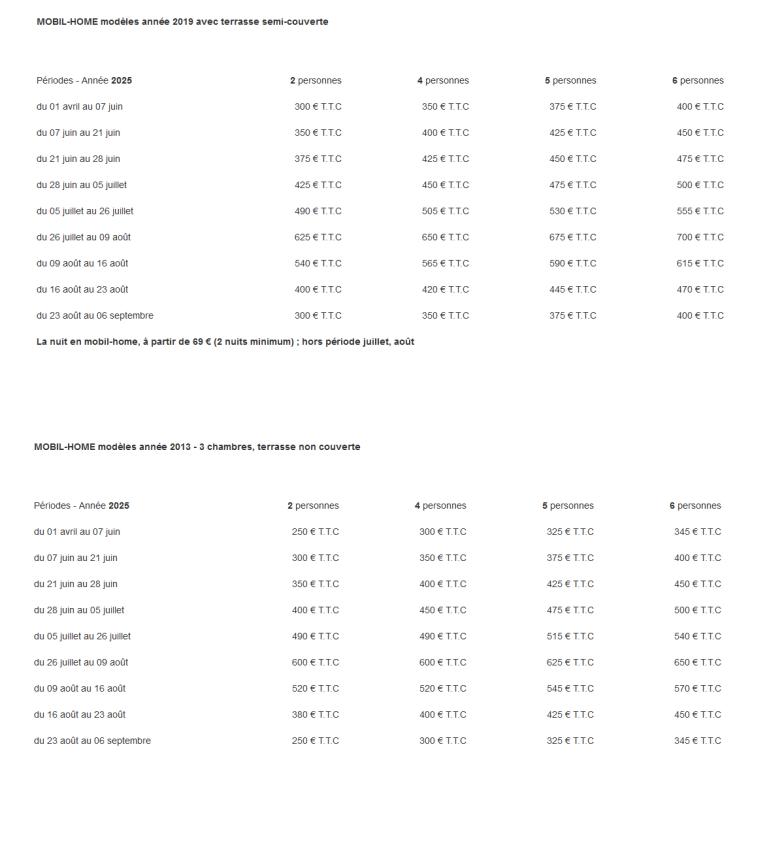 Tarifs 2025 de location à la semaine