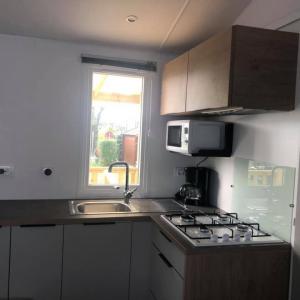 Mobil-Home de 4/6 places, comprenant 1 chambre avec un grand lit, deux chambres avec 2 lits d'une personne (1 couverture par lit), un salon, une cuisine (cuisinière à gaz, micro-onde) une salle de bains (douche et wc séparés), chauffage, terrasse et meubles de jardin. Draps et linge non fournis